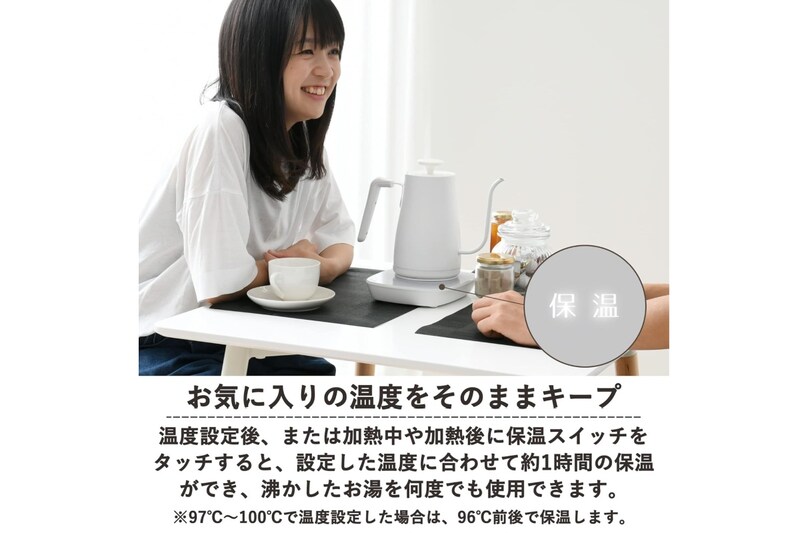 Amazonでみる温度調節機能付きで、飲み物やインスタントフードに合わせてお好みの湯温にしやすく、保温機能も備えているため、沸かし直す手間を減らすことができます。