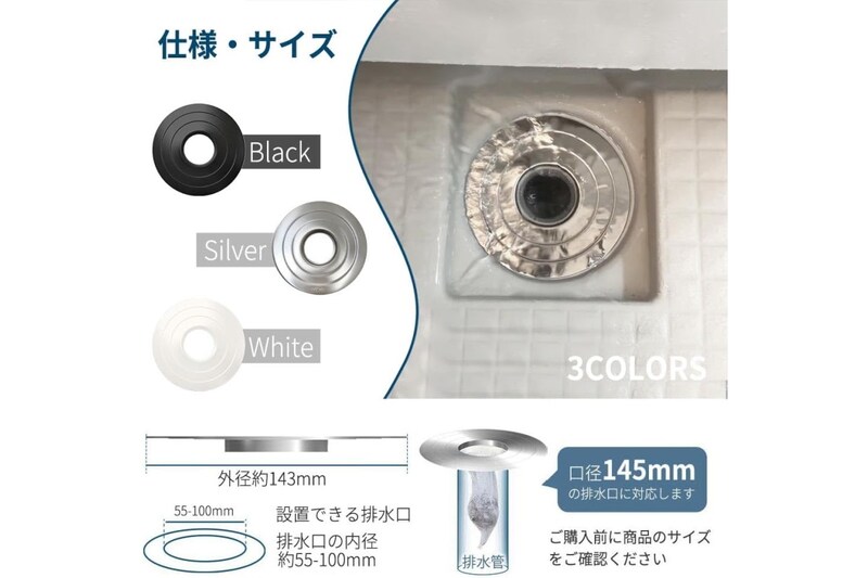 Amazonでみる内径約55〜100mmの排水口に合う設計で、外径は約143mm。
