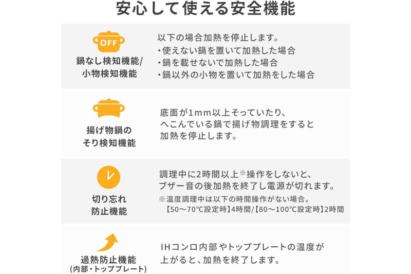 Amazonでみる安全面にも配慮されており、切り忘れ防止や過熱防止などの安全機能によって、長時間の調理でも安心して使いやすい設計です。