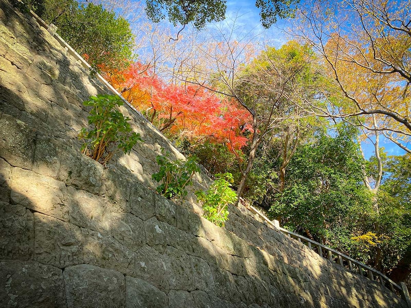 海側のルートは、石垣に沿って蛇行しながら進みます。「17曲りの石段」と呼ばれており途中、上を見上げると、石垣から生える木々を愛でることもできます。長い階段なので休みながら進みましょう。