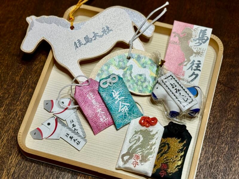 そんなわけで、馬にまつわるお守りやおみくじも! グリーンの絵馬と美しい織り地の「生命守」は、生駒在住のアーティスト・良奈(よしな)ちはるさんがデザインを手がけたもの。