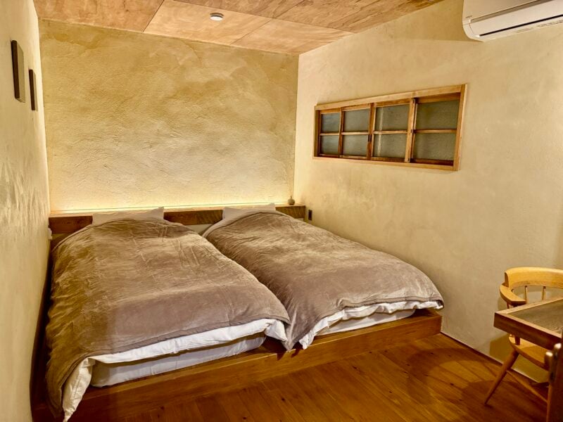 いわゆるゲストハウスというよりは、リーズナブルに泊まれるプチホテルのようなnatomi宿。とくに定員2名の洋室「山粧う(やまよそおう)」は、ゲストハウスビギナーでも安心のプライベート感です。ちなみに、お手洗いとシャワーは共有です。
