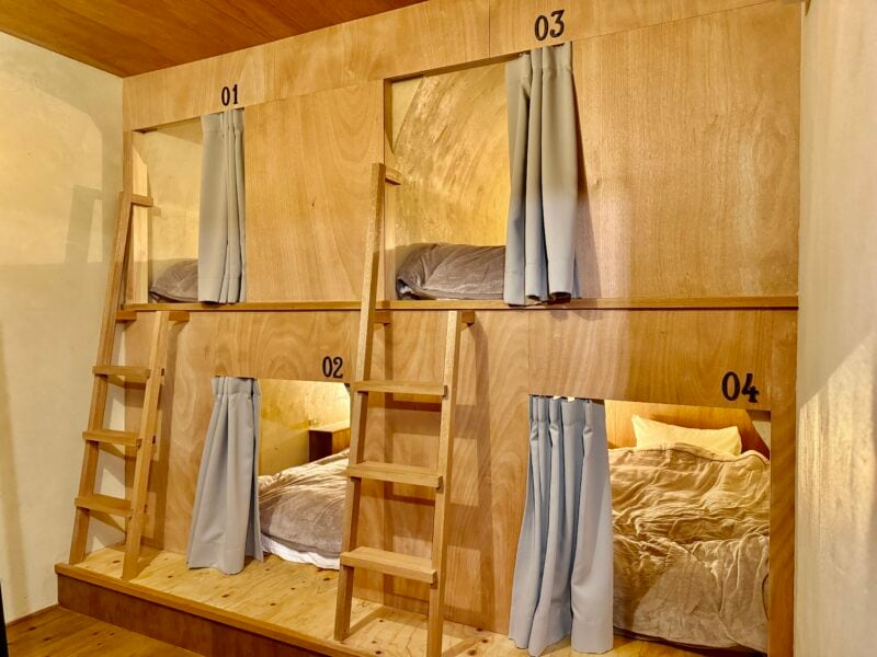 ドミトリータイプの「山眠る(やまねむる)」は女性専用。洞窟みたいなアーチ形天井の個室に入ると、まゆの中にいるみたいで落ち着けそう。