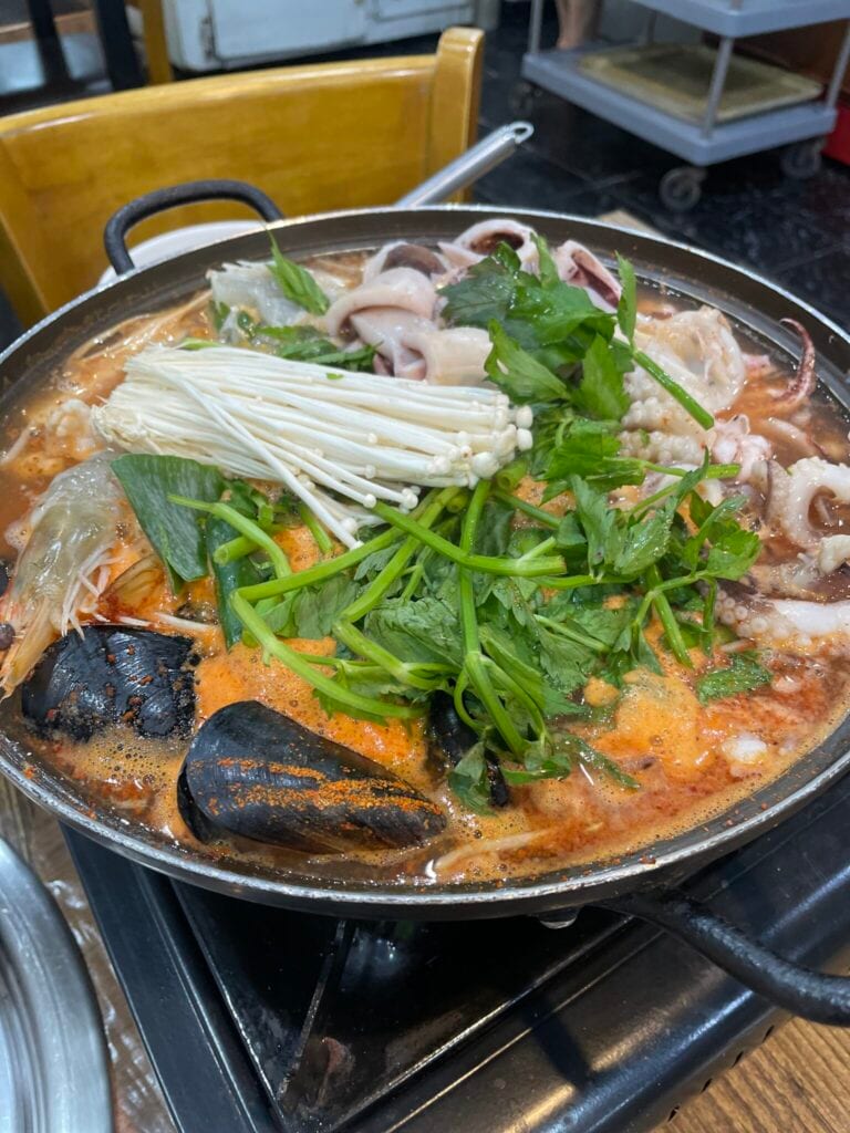 続いて、こちらの鍋は見た目の通り、ムール貝やイカ、エビなど海鮮がたくさん入っている「メウンタン」。以前、宿泊した淑大入口(スクテイック)駅からちょっと路地に入ると、海鮮鍋の店が並んでいる通りがあります。そこで、なんとなく良さそうと思って入ってみた店(google MAP上では『대군회관』と出てきます)で食べたのが、こちらの鍋。「メウンタン」とは、辛いという韓国語「メウン」とスープの「タン」を組み合わせた言葉。魚のアラから取った出汁と魚介から出る滋味深い味、そして唐辛子粉が溶け合い、まさに箸がとまらないおいしさ。見た目は赤くて辛そうですが、魚介から出る甘みで、そこまで辛くないのも、箸が進む理由。日本ではめったに飲まないソジュ(焼酎)が合うこと、このうえなし。旅ならではの、良さそうと思って入った店がおいしかったら、嬉しいですよね。