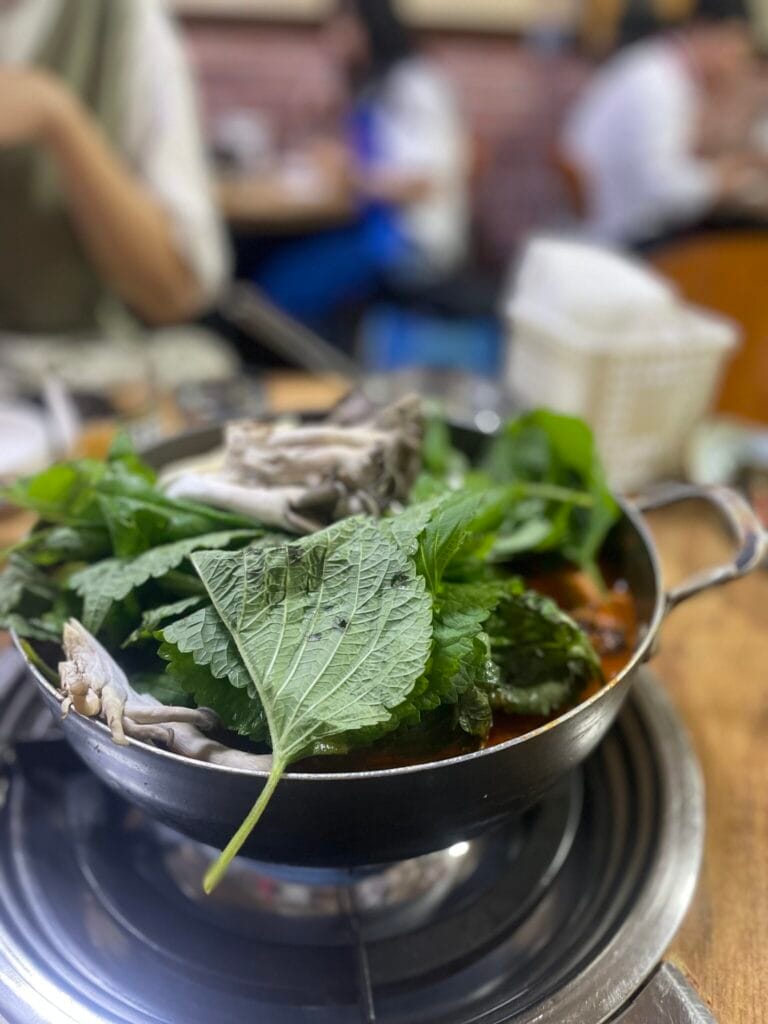 さて、「この鍋は一体、何の鍋でしょう?」と聞かれて、どのくらいの人がわかるでしょうか。この大きなエゴマの葉で覆われたスープの中に入っている具材は、鶏とじゃがいもなのです。メニュー名は「タットリタン」。韓国ならではの唐辛子入りの赤いスープで、じゃがいもと鶏肉を煮込んだ鍋。鶏はもちろん、じゃがいものホクホク感がたまりません。煮込めば煮込むほど、どんどん甘みが出てくるので、時間が経つにつれ、辛さは気にならなくなっていきます。食べ終わる頃には、じゃがいもがスープに溶け込み、とろとろのペースト状に。大好きなソメク(焼酎+ビール)が進む味です。