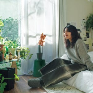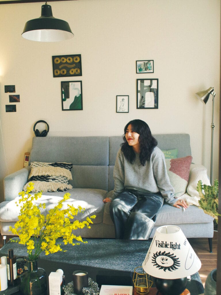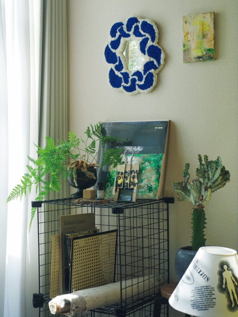 「ひとり暮らしを始めてグリーンが好きになりました。ベッドの近くのコーナーにガラスのテーブルを置き、植物や花瓶を並べて。少し置くのではなく、“埋めつくす”くらいのボリューム感がポイント。このコーナーが家のシンボルです。そこでお香をたいて、好きなアートブックを眺める時間がリラックスになる。あまりに居心地が良すぎて、外に出られなくなっちゃうんですよね(笑)」