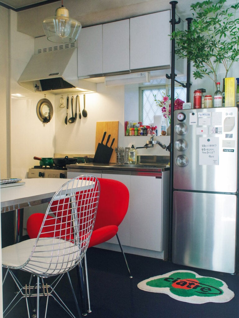 「キッチンはなるべく生活感が出ない空間にしたくて冷蔵庫はシルバーを選びました。デザインが気に入っている韓国のビールやスピリッツ、その隣に天井まで届きそうな背の高いグリーンを生けています。それだけで楽しい空間になりますね」