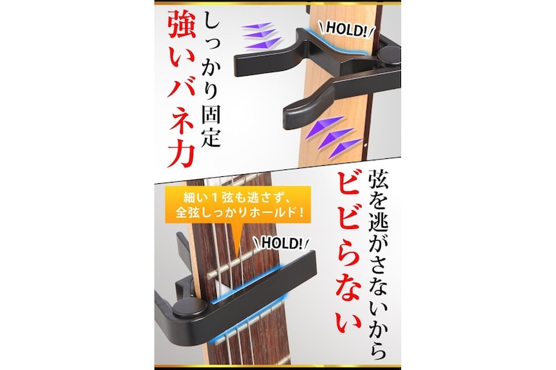 このカポの特徴は、しっかりとしたホールド力と音の安定感です。