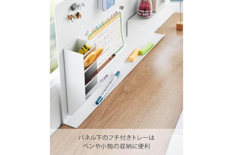 デスクまわりをすっきり整えたい人に向いているのが、山崎実業のデスク横トレー付きスチールパネルです。