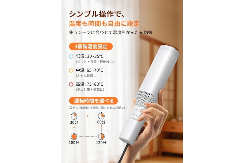 3段階の温度設定と30〜180分のタイマー機能があり、季節や用途に合わせて使い分けしやすい点も魅力です。