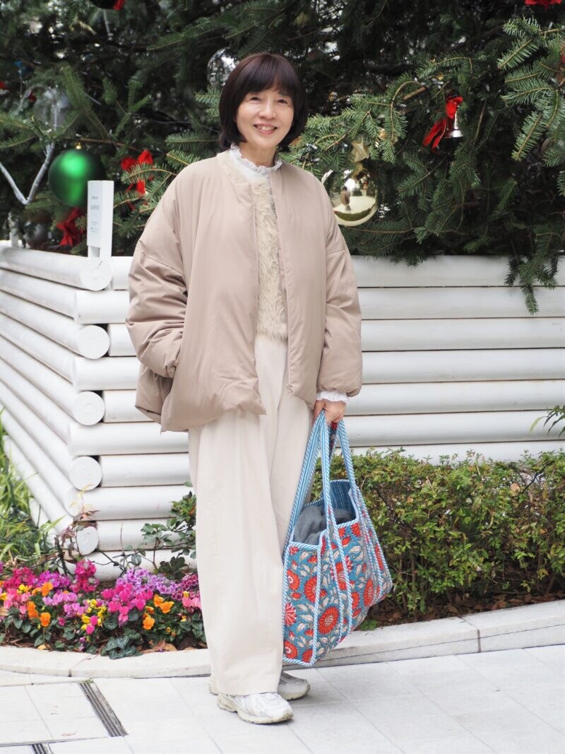 ヤギさんがこの冬愛用しているのは、丸みのある女性らしいフォルムのダウンジャケット。シームレスなつくりが品のある装いにマッチ。ショート丈のニットに落ち感のある白のワイドパンツを合わせることで、スタイルアップも意識しているのだとか。