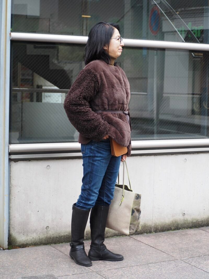 「身長が低いので、丈感と全体のバランスを考えてコーディネートを組んでいます」と林さん。ボリュームのあるダウンジャケットにコンパクトなミニスカートという、メリハリのあるスタイリングがステキです。ダウンとウールで季節感もアップ!