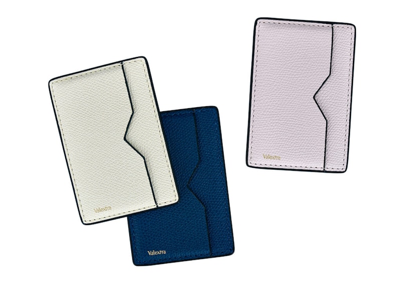 〈ヴァレクストラ〉から、iPhoneの背面にマグネットで装着できるMagSafe対応のカードケースが登場。微細な丸いシボと優美な質感を持つカーフスキンに、ブランドの頭文字「V」のカッティングが施され、カードが取り出しやすい工夫も。定番色はもちろん、美しい発色が自慢の豊富なカラーバリエーションが揃う。