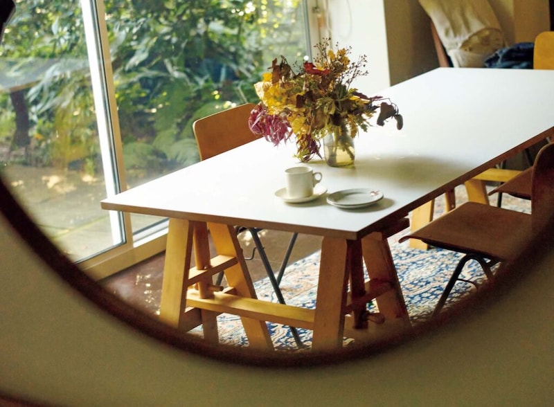 今回、訪ねたのはロンドン市内にある自宅。閑静な住宅街にある住まいはマーガレットが日々過ごしている場所だ。ヴィクトリア朝時代に建てられた建物は、かつての馬車小屋で馬車を収容するために屋敷に併設された〝コーチハウス〞を改装したもの。見学するまではあまり気乗りしなかったそうだが、実際に訪れてみると大きな窓から望む庭の木々の緑や差し込む光の美しさに惹かれて、すぐに「ここが自分にとっての家だ」と確信したという。装飾の多かった内装は、イギリスの『マーガレット・ハウエル』の店舗デザインを手がけた建築家のウィリアム・ラッセルに依頼し、シンプルでモダンな空間にリノベーションした。