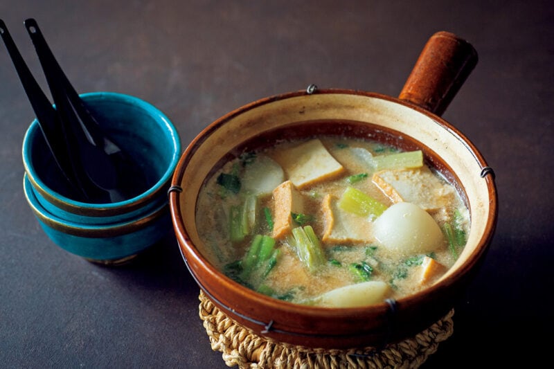 3. 2にかぶの葉を入れ、しんなりしたら豆乳とみそを溶き入れる。煮立てると分離するので、温める程度で火を止める。