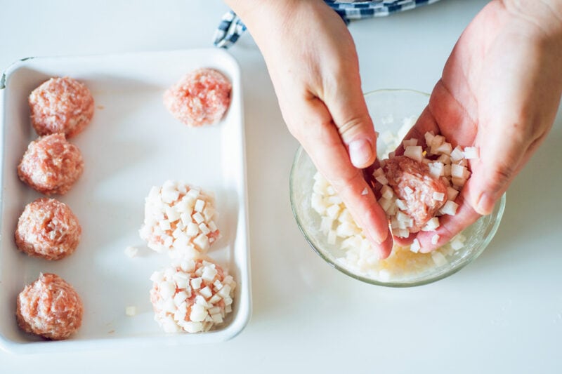 肉だねにれんこんを隙間なくつけたら、手のひらで軽く押して整えるとはがれにくくなります。