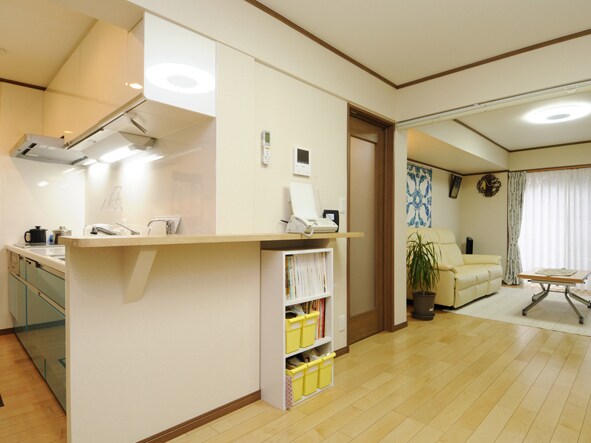 キッチンは、独立タイプからオープンキッチンに変更。オープンタイプですが、壁付けにすることで独立タイプのように調理に集中できる環境になりました。