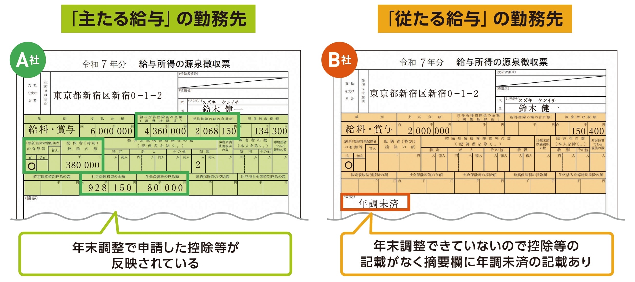 「主たる給与」、つまりメインの勤務先の源泉徴収票では、給与所得控除や社会保険料控除などが反映されていますが、一方で、サブの「従たる給与」の勤務先の源泉徴収票では「年調未済」と記載されており、控除等を反映しないまま源泉徴収が行われています。