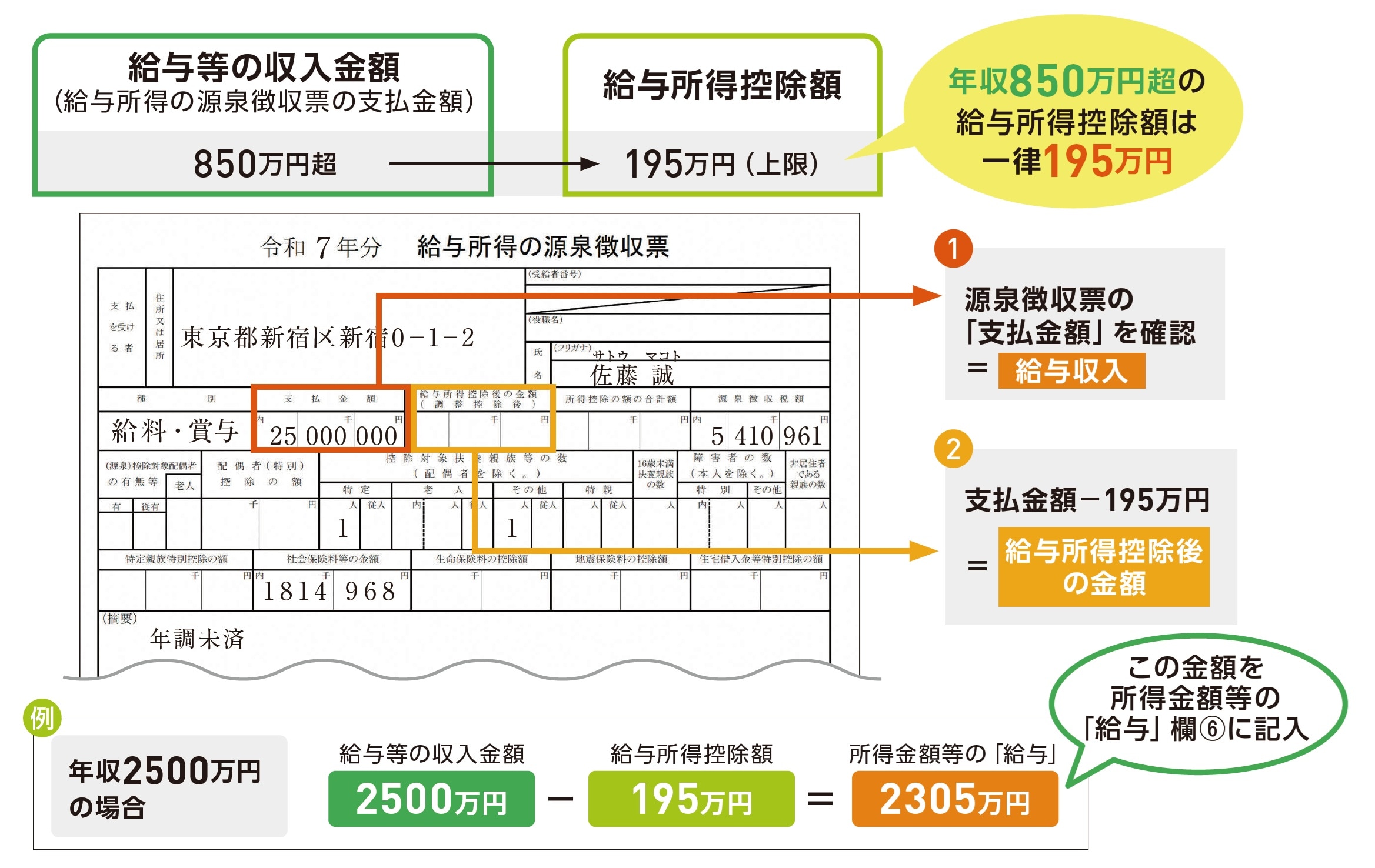 次に、給与所得控除額を計算します。年収850万円超の給与所得控除額は一律195万円なので、支払金額から差し引き、「所得金額等」の「給与」欄に記入します。