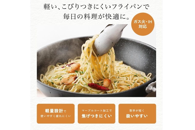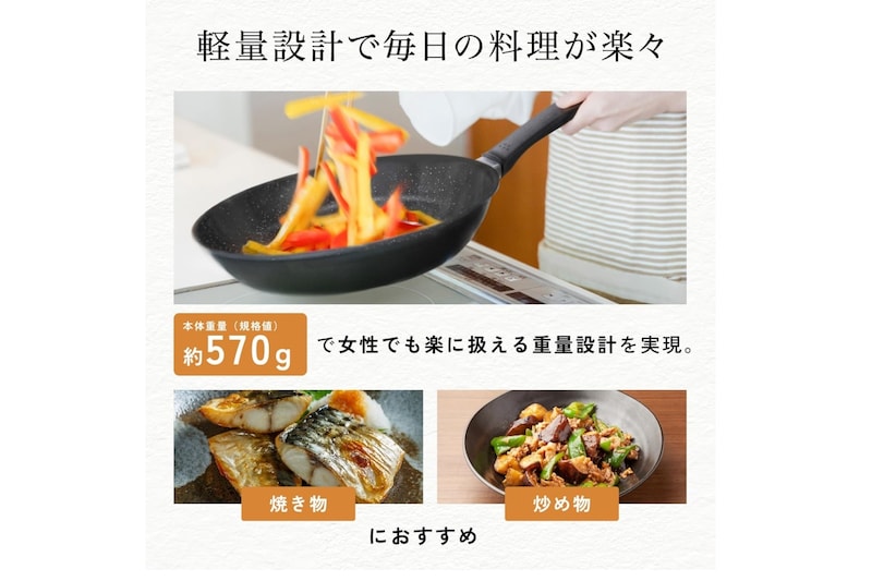 Amazonでみる軽量設計なので、コンロ上での振りや片手での盛り付けも負担になりにくく、炒め物や目玉焼きなどの定番メニューがテンポよく作れます。