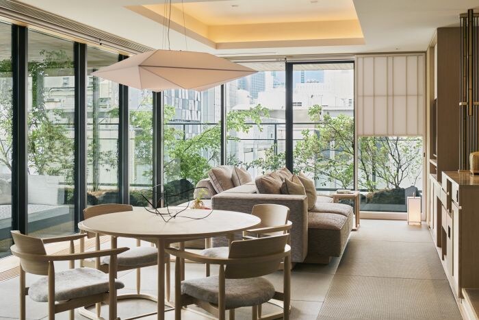 客室は全34室。スタンダードの広さが55㎡というゆったりした開放的な空間で、四季と自然、日本の伝統と現代の感性が交差する。そして、各室ともテラス付き。草木が植えてあり、座れるスペースも。日本の伝統的な建具である雪見障子が風情を演出。銀座の宿泊施設で窓を開けられるというのも、都心とは思えないぜいたくさ。銀座の街の音までも心地良い。