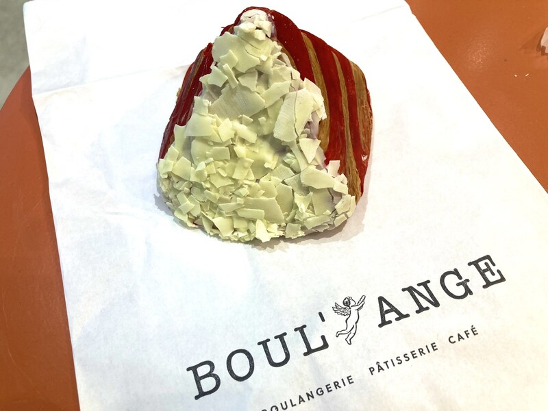 お店の前に椅子とテーブルが置かれていたので、そちらで頂きました。ピラミッド型のクロワサッサンで、フランボワーズのソースがかかり、ホワイトチョコがトッピングされています。まるで山の斜面に雪が積もったようなキュートなクロワッサンです。クラムはしっかり目で、フランボワーズの酸味とチョコの甘さとが心地よいクロワッサンです。