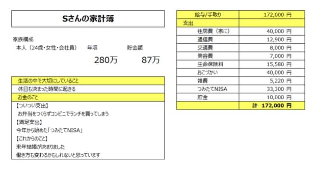 FPオフィス「フォルテシモ」へ依頼されたお客さまの家計簿を、mymoで診断する【うちの家計簿】。今回は来年結婚の予定がある会社員24歳女性、Sさんの家計簿です。