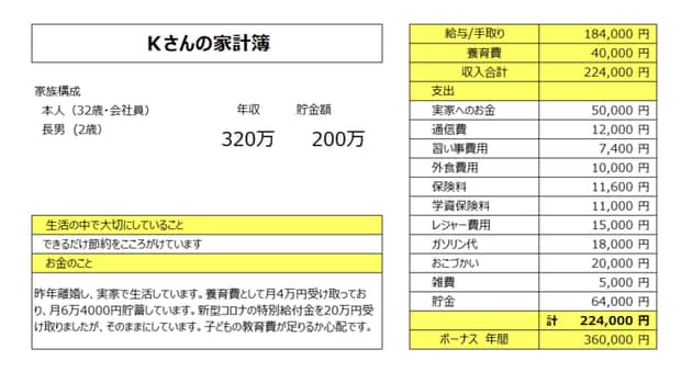 FPオフィス「フォルテシモ」へ依頼されたお客さまの家計簿を、mymoで診断する【うちの家計簿】。今回はシングルマザーで2歳の息子さんと実家で生活されている会社員32歳女性Kさんの家計簿です。子どもの将来を考え、養育費をどのように管理すべきか悩んでいらっしゃいます。