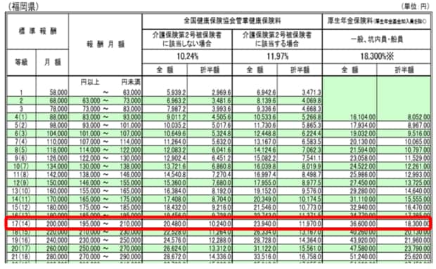 一方、各都道府県の協会けんぽに加入している場合は以下のようになります。17等級を赤で囲んでいますが、月額19万5000円~21万円の場合、標準報酬月額が20万円とみなされ、表に記載されている折半額が差し引かれることになります。なお、40歳以上は「介護保険第2号被保険者」に該当するため、介護保険料分も上乗せされます。