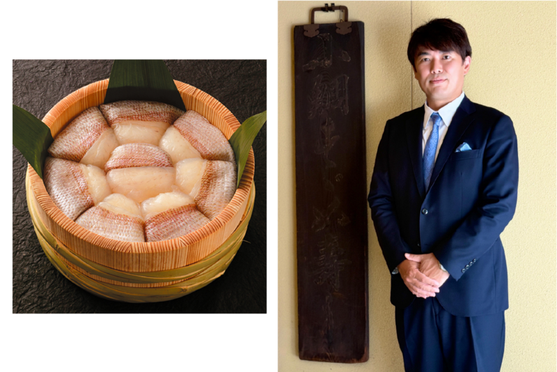 京都の仙洞御所に献上する際に二才ものの小鯛を使い、以来「小鯛雀鮨®」が店の看板商品に。当時のすしを再現した「古傳桶詰(こでんおけづめ)」(写真左。写真提供:すし萬)」は、予約限定商品。