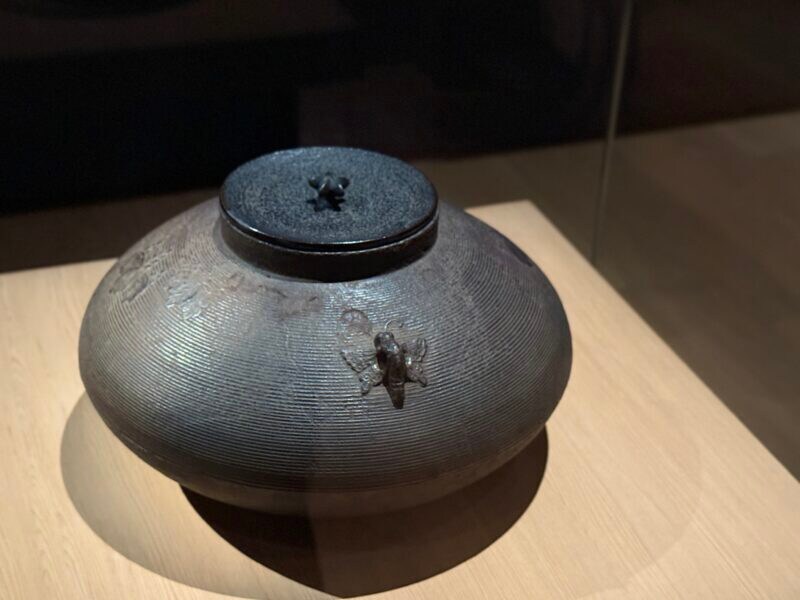「虫」の展示からは「古芦屋糸地蒲団型釜(こあしやいとじふとんがたかま)」をピックアップ。蛾らしき虫がくっついています。