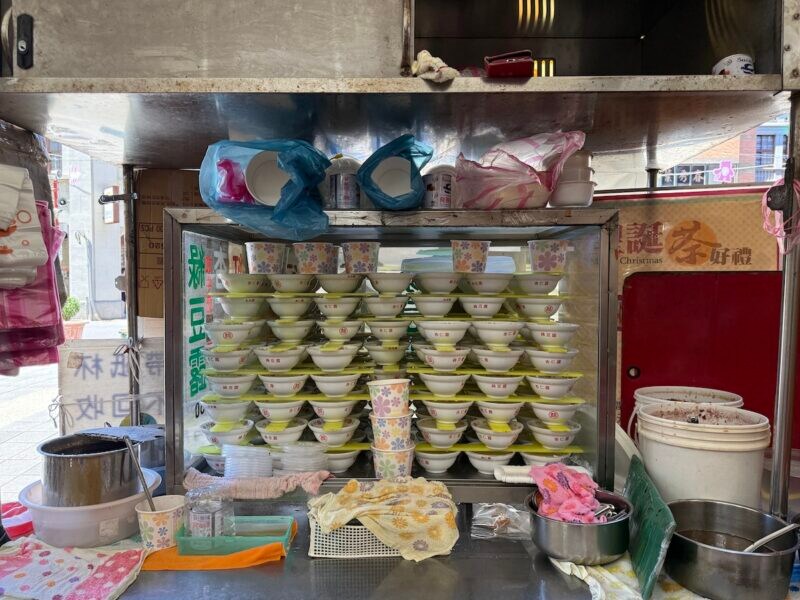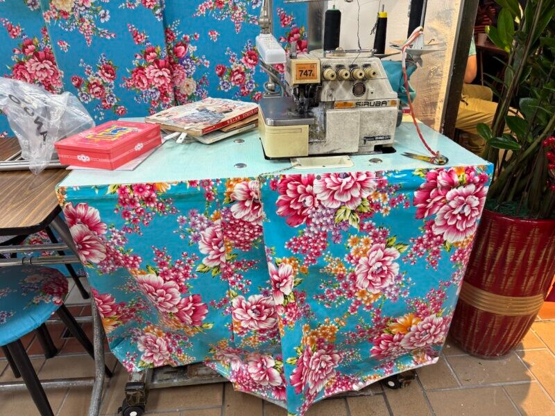 からすみ屋さんの台やお仕立て屋さんのミシン台にかかっている華やかな色合わせの生地が、わたしのイメージする「これぞ台湾」の花模様です。