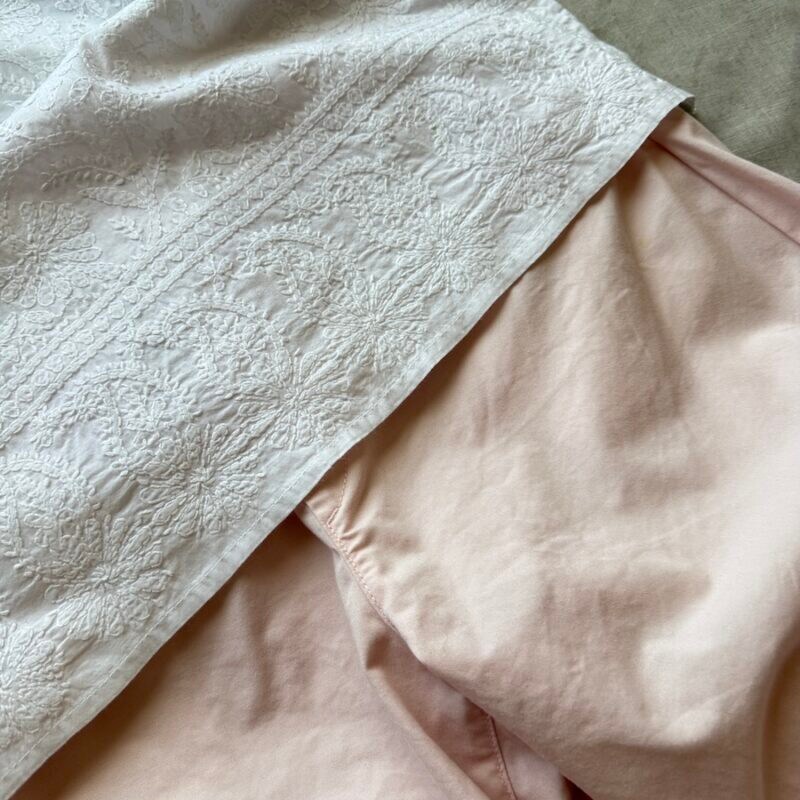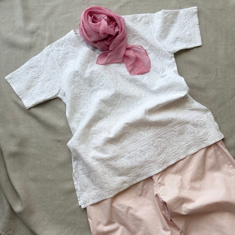白いブラウスとピンク色のパンツの組み合わせ。北インドの伝統刺繍チカンカリです。シンプルですが、とても気に入っているコーディネートです。