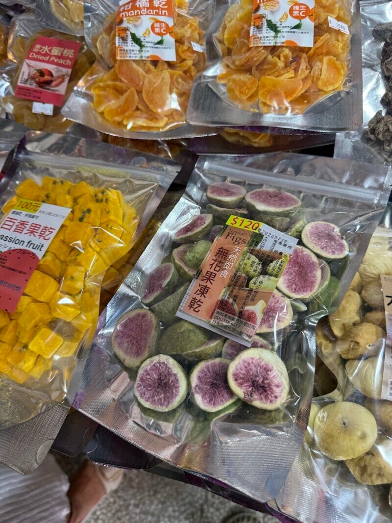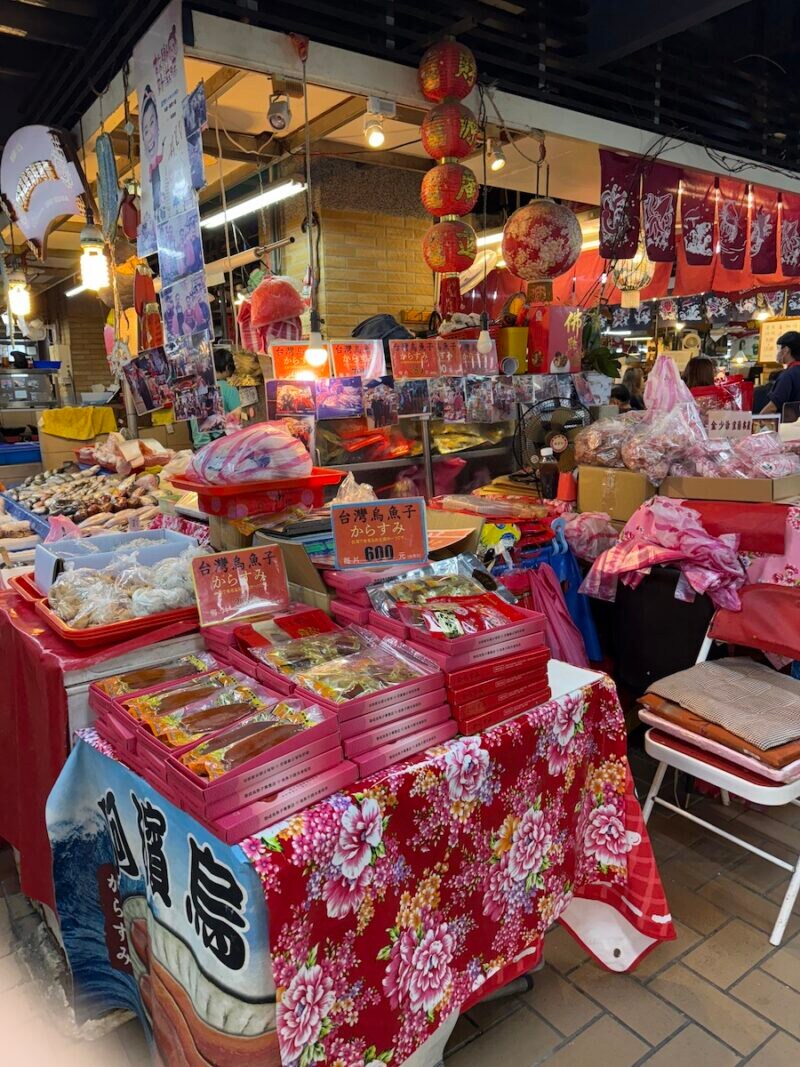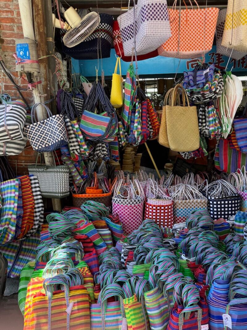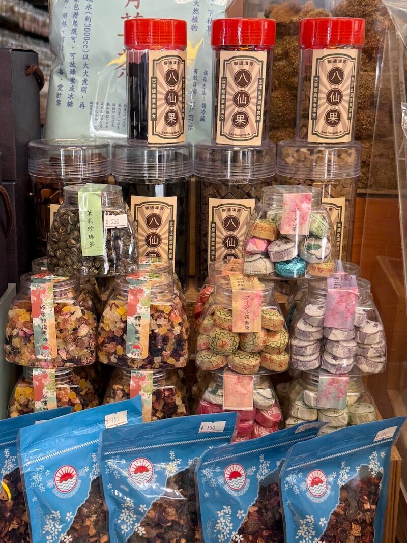 2日目は午前中に迪化街(ディーホアジェ)へ。趣(おもむき)のある低い建物が連なる通りの両側に、乾燥果物や漁師網のバッグ、おみやげ屋さんが並びます。友はおしゃれなチョコレートや名物の唐辛子のおやつをおみやげに選んでいました。わたしは台湾茶をおみやげに。