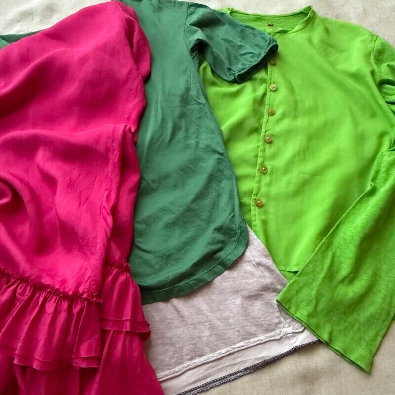 緑色のシャツにブーゲンビリアのピンク色のシルクのパンツ、薄紫色のキャミソールをシャツの裾から見えるように。羽織には黄緑色のカーディガンを合わせました。東京の風景の中では色が強過ぎるかなと思う組み合わせですが、「台北の街の一部になりたい」の意気込みで。