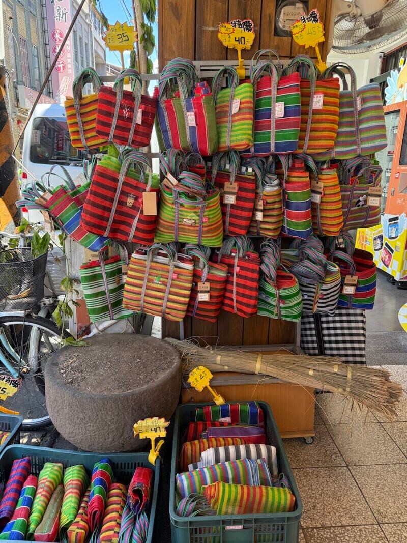 漁師網のバッグはこれだけカラフルにたくさん並んでいるのを見ますとふわぁっと物欲が湧いてきます。ごちゃごちゃ具合が絶妙に美しい店先でした。