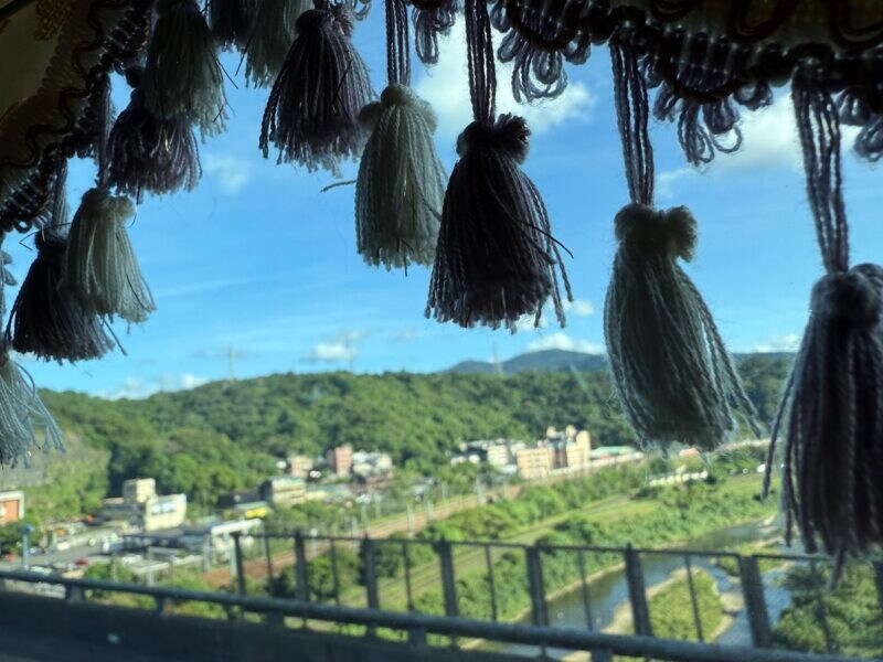 九份老街と十分での天燈上げのバスツアーに参加しました。バスの窓には可愛いタッセル付きのカーテンがかかっています。