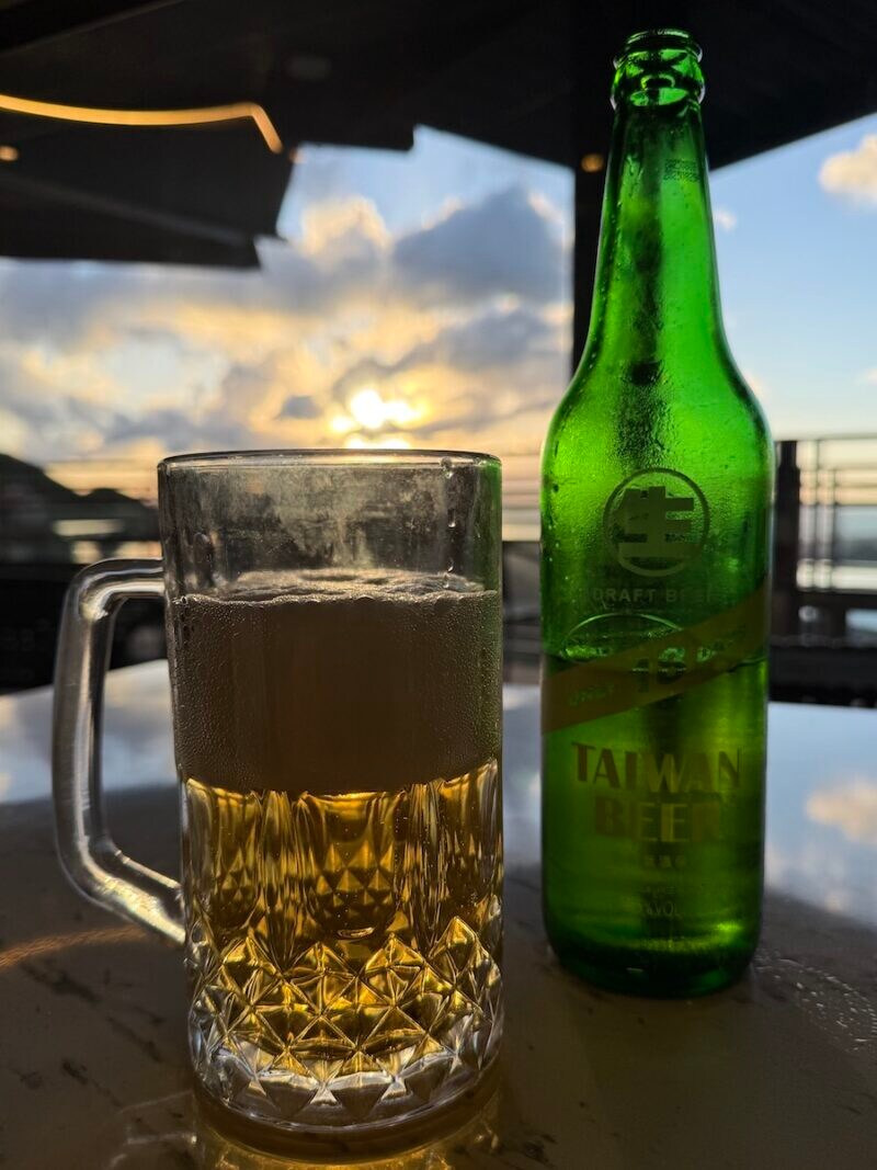 夕陽が沈むのを眺めながら台湾ビールがカッコイイひとときでした。再びバスに乗り、十分へ移動します。