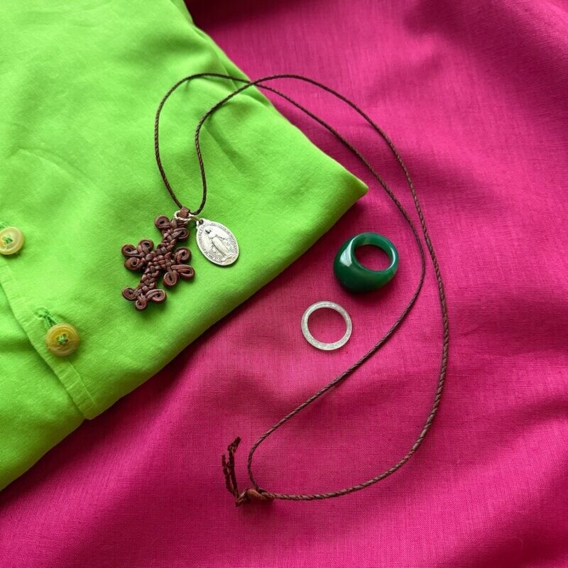旅のお供のアクセサリーです。友よりいただいた、パリの「奇跡のメダイ」と呼ばれるマリア像のペンダントトップを、革製のクロスに通しましたら素敵になりました。手には韓国で購入した翡翠のリングを。