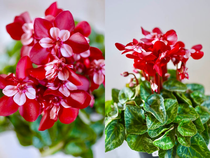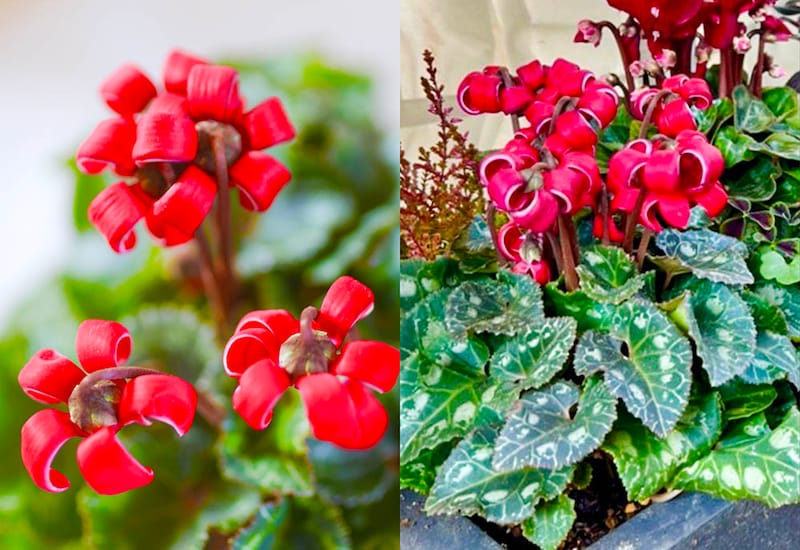 白いガクと艶やかな赤い花弁のコントラストが個性的で、バイカラーになるつぼみもおしゃれ。寒さにも比較的強いので室内でも屋外でも楽しめ、ガーデンシクラメンとして地植えも可能です。連続開花性に優れ、たくさんの花が咲き、花もちもよいため、観賞期間が長いのも魅力。鉢植えにして、上から眺めるのもおすすめ。