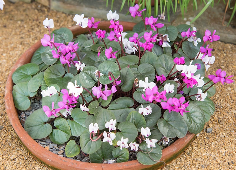 コウム(Cyclamen coum (Eastern Sowbread))は、一般的な園芸店などでも入手しやすい原種のシクラメン。花色は白から濃いピンク、紫までと幅広く、丸みを帯びた葉が特徴です。耐寒性があるので、屋外での越冬が可能。夏場は地上部が枯れて休眠します。