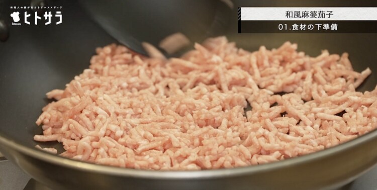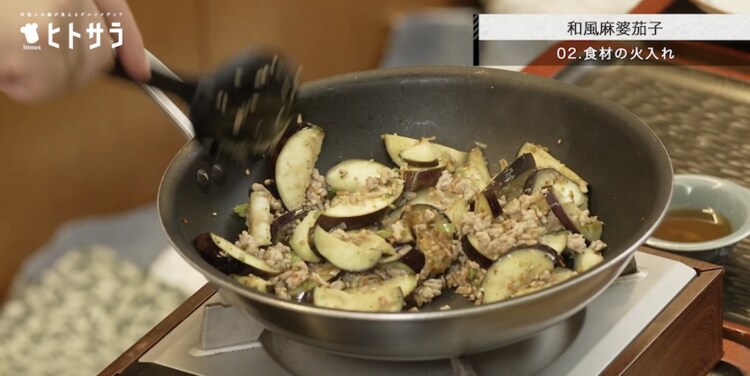 肉に火が通ったら、みじん切りにした長ねぎの白い部分としょうがを加えます。肉の表面をしっかりと焼き切るように炒めることで、臭みを抑え、香ばしさを引き出します。続いて、3〜4cmほどの大きさに切った茄子とごま油の半量、こしょうを加えて炒めます。茄子が油を含んでしっとりしてきたら、一度火を止めます。