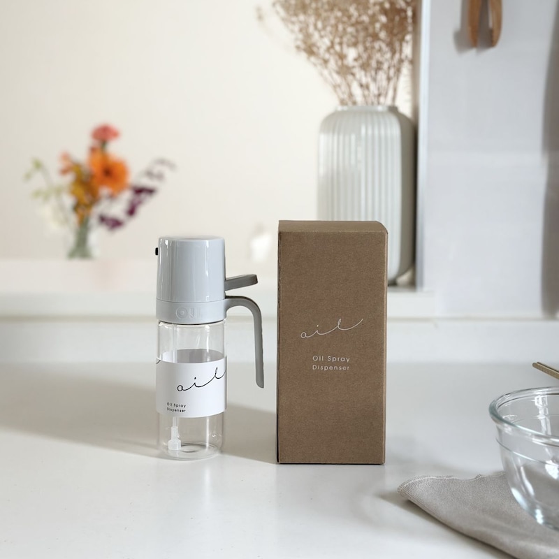 今回はそんなオイルスプレーボトルを取り入れたインスタグラマーさんのお声をご紹介。ライトグレーのボトルがキッチンに馴染む、素敵なお写真も届けてくださいました。