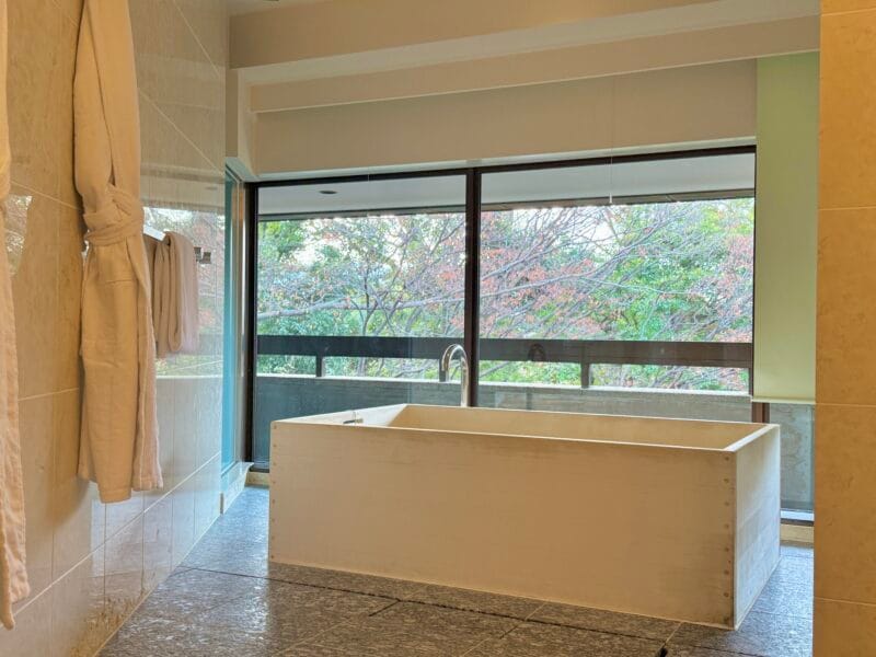 良い香りがする広々としたヒバ風呂が嬉しい〜! ちなみに窓にはスモークが貼られているので、外から見える心配はありません。