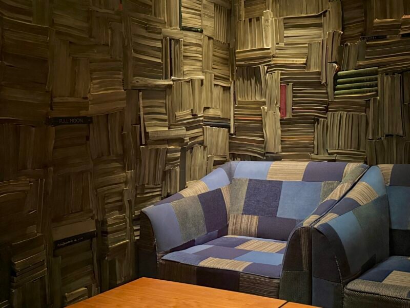 テーブル席の古本の壁にびっくり! ちゃんと固定されていますが、いくつかの本は出し入れできる遊び心も。自分で探さず、お店の方に聞いてくださいね。