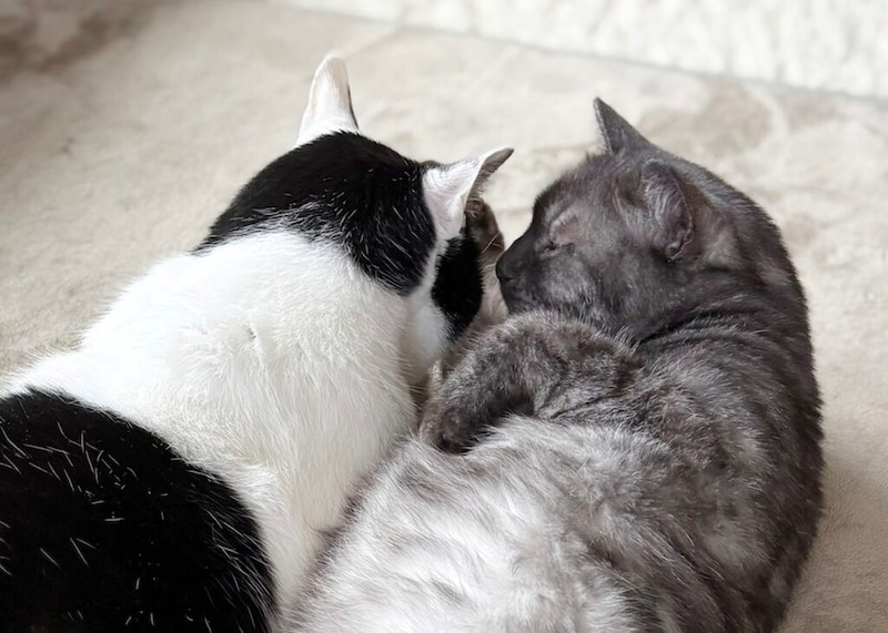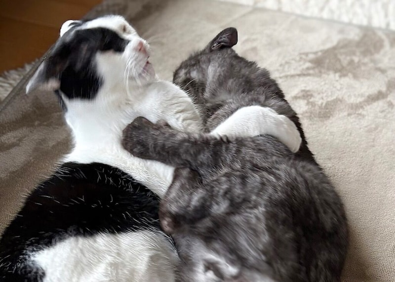 ホットカーペットの上で、えいたが珍しくいっくんの毛づくろいをしている。耳のうしろから首まわりまで、なかなか丁寧。えいたもちょっと兄らしくなったなぁ、と感慨に浸っていると、いきなりいっくんの腹キック。とんだ癒やし系暴れん坊だな。でも、この光景を見て、はっとした。これ、昔、えいたが、兄ねこのしろたろにやっていたやつじゃないか。しろたろの愛情にまったく応えず、やんちゃだった頃。今度は自分が同じ役回りを引き受けている。