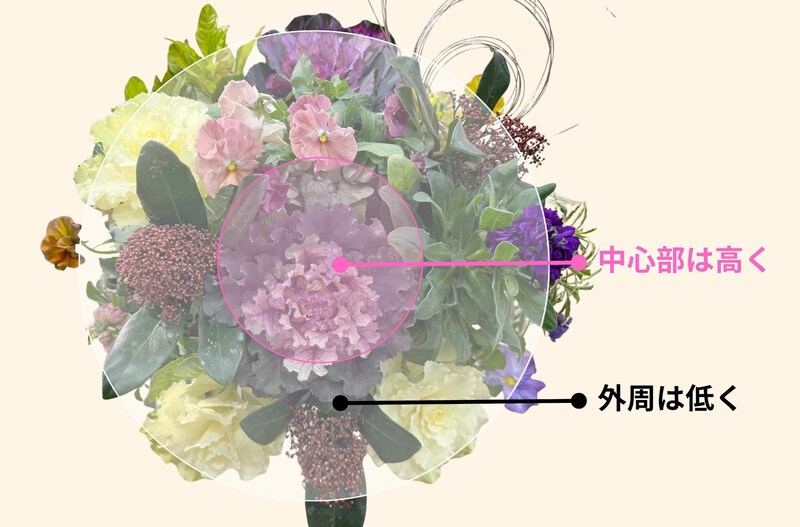 ハンギングバスケットはハンギング専用のスリットのある鉢を用います。苗を横にして、5つのスリットにスライドさせるように植え込んでいき、最上部の3段目はスリットだけでなく奥にもやや直立させて2〜3株を植え込み、丸い半円形の形を目指します。美しい丸い形を作るには、円の中心部となる2〜3段目中央を意識して高くするのがポイント。円の中心部は最も目が留まる箇所なので、主役となる植物を配置します。