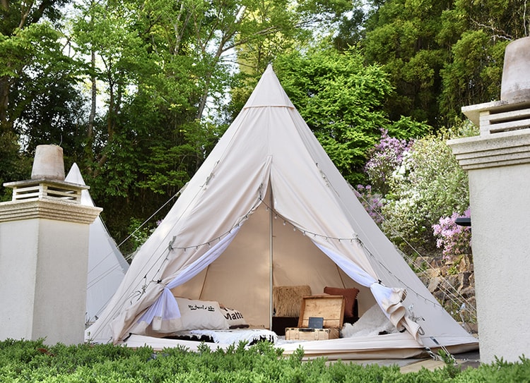 清らかなロケーションで、自然の中で食事をする非日常体験ができます。それぞれのテーマに合わせたデザインやデコレーションが異なるテントは、いずれも広々とした空間。テントのそばにタープを張っているので雨の日にも対応。ヨガなどのアクティビティイベントも実施しています。
