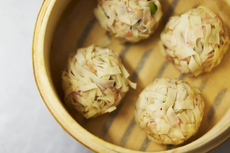 しゅうまいのタネを丸め、しゅうまいの皮をまぶす。