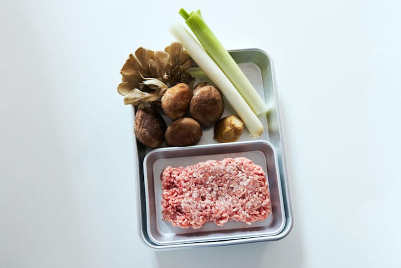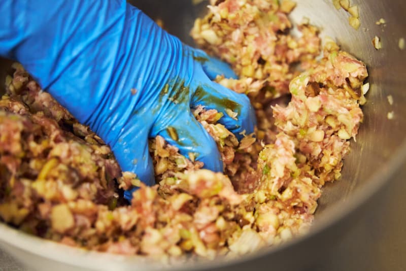 ではタネを作ります。長ネギとお好きなきのこ類、生姜を粗みじん切りにし、片栗粉をまぶしておきます。今回のきのこは、しいたけ多めで舞茸とミックスしました。次に豚ひき肉と合わせて、粘り気が出るまでしっかり混ぜる。最後に卵と調味料の醤油、オイスターソース、ごま油、砂糖、塩、ホワイトペッパーを入れて再度混ぜます。出来上がったタネは、一口サイズのボール状に形成しましょう。